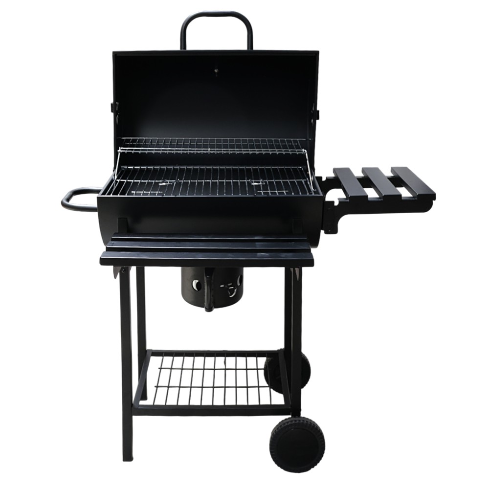 This charcoal barbecue is the ideal choice for those who want to enjoy delicious and safe grilling in the garden or patio. With a sturdy metal structure and generous dimensions, it offers enough space to prepare meals for family and friends effortlessly. The cooking grate has dimensions of 55x34 cm and is chrome-plated, ensuring even heat distribution and uniform grilling. It has a side table and a wooden front panel for easier preparation and organization of food and accessories. It also has a built-in thermometer for accurate temperature control.
