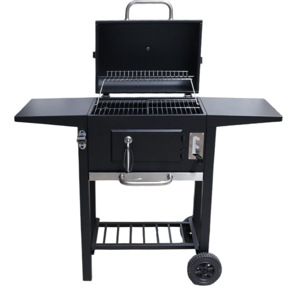 This charcoal barbecue is the perfect choice for those looking for the ideal combination of functionality, resistance and modern design. With a body made of high-quality steel and measuring 109 x 46 x 94.5 cm, it offers ample cooking space without taking up much space in the garden or veranda. Made of carbon steel with a high-temperature resistant paint coating, for durability and longevity. Two cooking grates measuring 21 x 30 cm, enameled in black for healthy grilling and easy cleaning. This barbecue has two steel side tables measuring 33 x 30 cm, ideal for preparing food and storing BBQ accessories. The charcoal holder measuring 36.5 x 25 cm allows you to adjust the height as needed and control the temperature easily. It has a built-in thermometer in the lid for accurate heat monitoring, a bottle opener for more convenience while baking, and stainless steel handles.