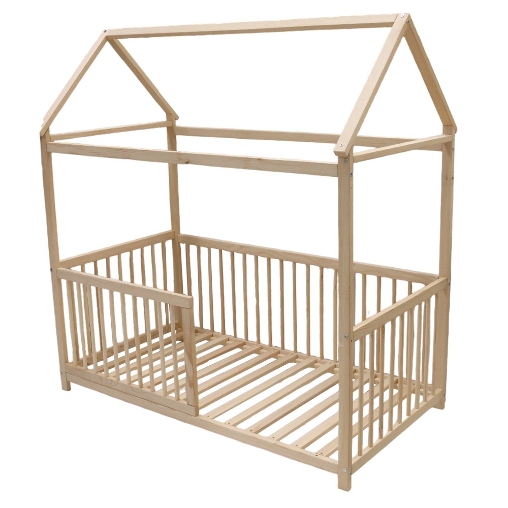 Children's bed made of wood. The bed has a design in the shape of a house and comes in natural color. It has a structure size of 145x150x79 cm, and a size in the mattress area of 140x70 cm. Can be designed with bed linen code 7810728, 7810729, and tents code 7810730, 7810731.