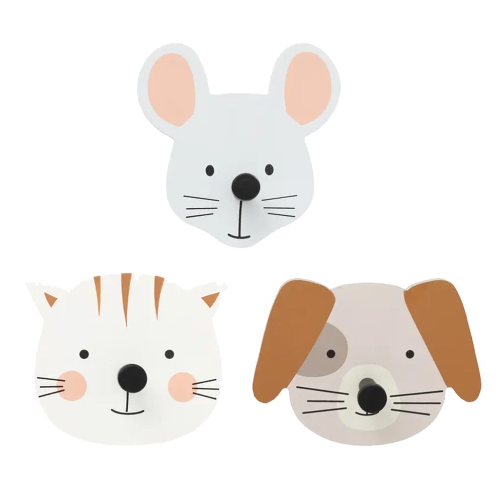 Children's room hanger with animal-shaped hooks. Made of MDF material, in different colors, measuring 36x9.5x4.5 cm. This hanger has 3 hooks for hanging clothes. Ideal for the bedroom, but also for schools or kindergartens.
