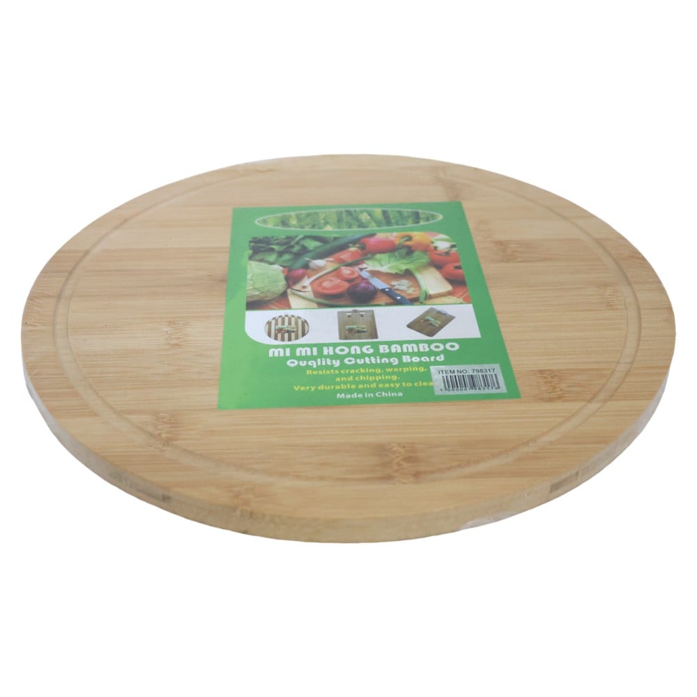 Circular bamboo cutting board in natural brown, diameter 30 cm. This product offers an elegant and functional choice for cutting meat, vegetables, or fruit.