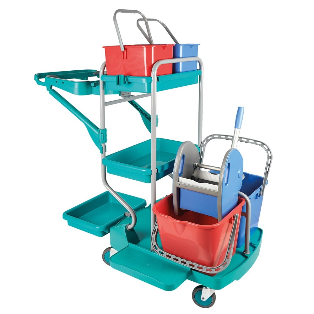 Professional bucket for cleaning hotels, villas or large areas, manufactured by the Italian brand "Perfetto professional", specializing in H.O.R.E.C.A items. The cleaning set contains the accessories needed for efficient cleaning. The set, which has a weight of 19.5 kg, is made of durable plastic and has a high resistance metal structure with 4 compartments. Equipped with 4 buckets - 2x9 Lt and 2 x15 Lt, the bottom compartment holds 2 buckets which are used for floor washing, fitted with plastic wrench with metal handle (rubber fitted handle on the sliding end), 2 floors others are optional where you can put cleaning napkins, washers, sponges or any other accessories necessary for a better cleaning. The upper floor contains 2 buckets which are optional by the user, can be filled with clean water or other cleaning accessories installed. In the carrier section there is space where you can put your garbage bag. Thanks to the carrier and the wheel drive, it's easy to move around. The colors of the set are resistant up to 90 ° C. Available in green - with blue and red buckets.