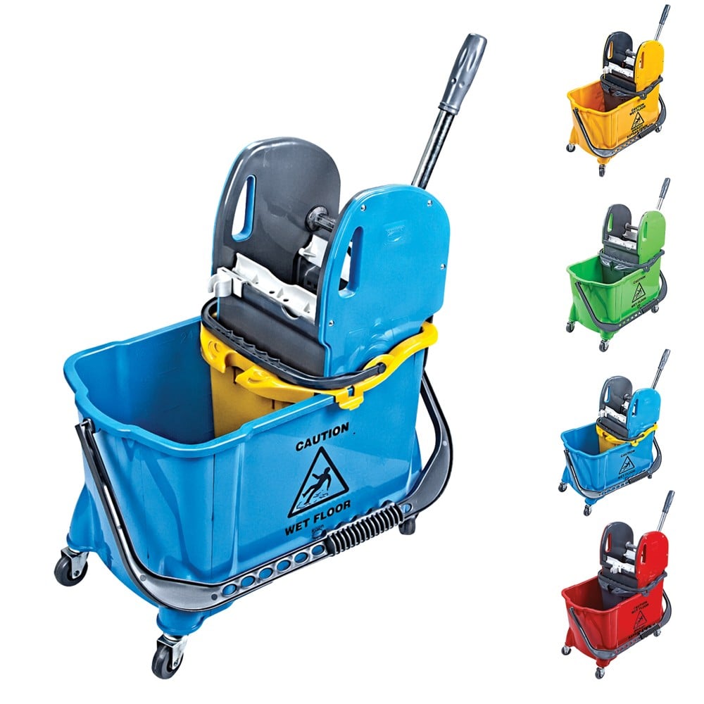 Cleaning bucket with handle, made of plastic material, equipped with 4 wheels that make it easier to move from one environment to another. It has a large bucket of 24 lt, and a small separating bucket of 10 lt, which separates clean water from dirty water. This bucket also has the function of the signal board "Caution wet floor".