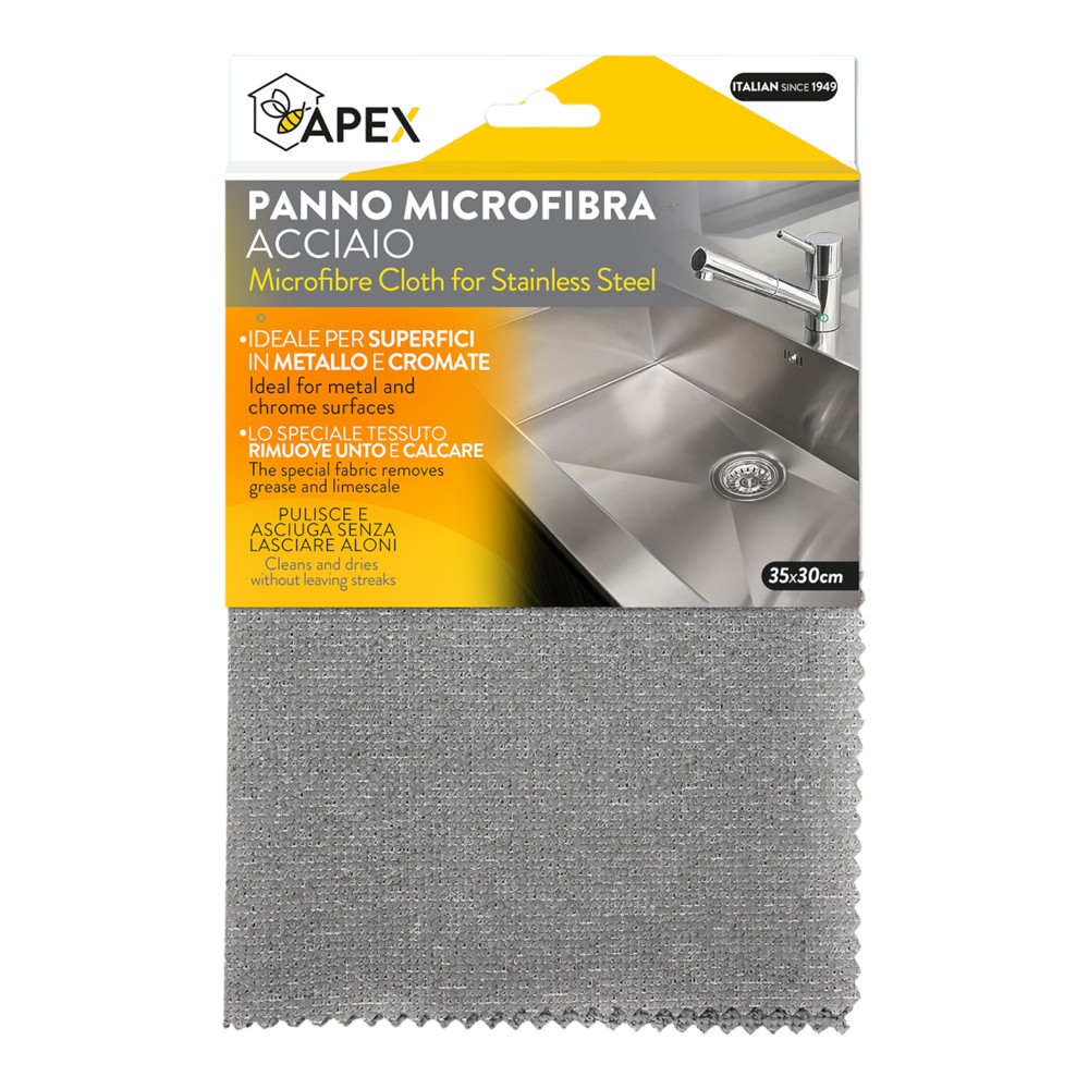 Special microfiber cloth for cleaning and drying metal and chrome surfaces. The special fabric removes grease and limescale. Cleans and dries without leaving streaks. Dimensions 35 x 30 cm.