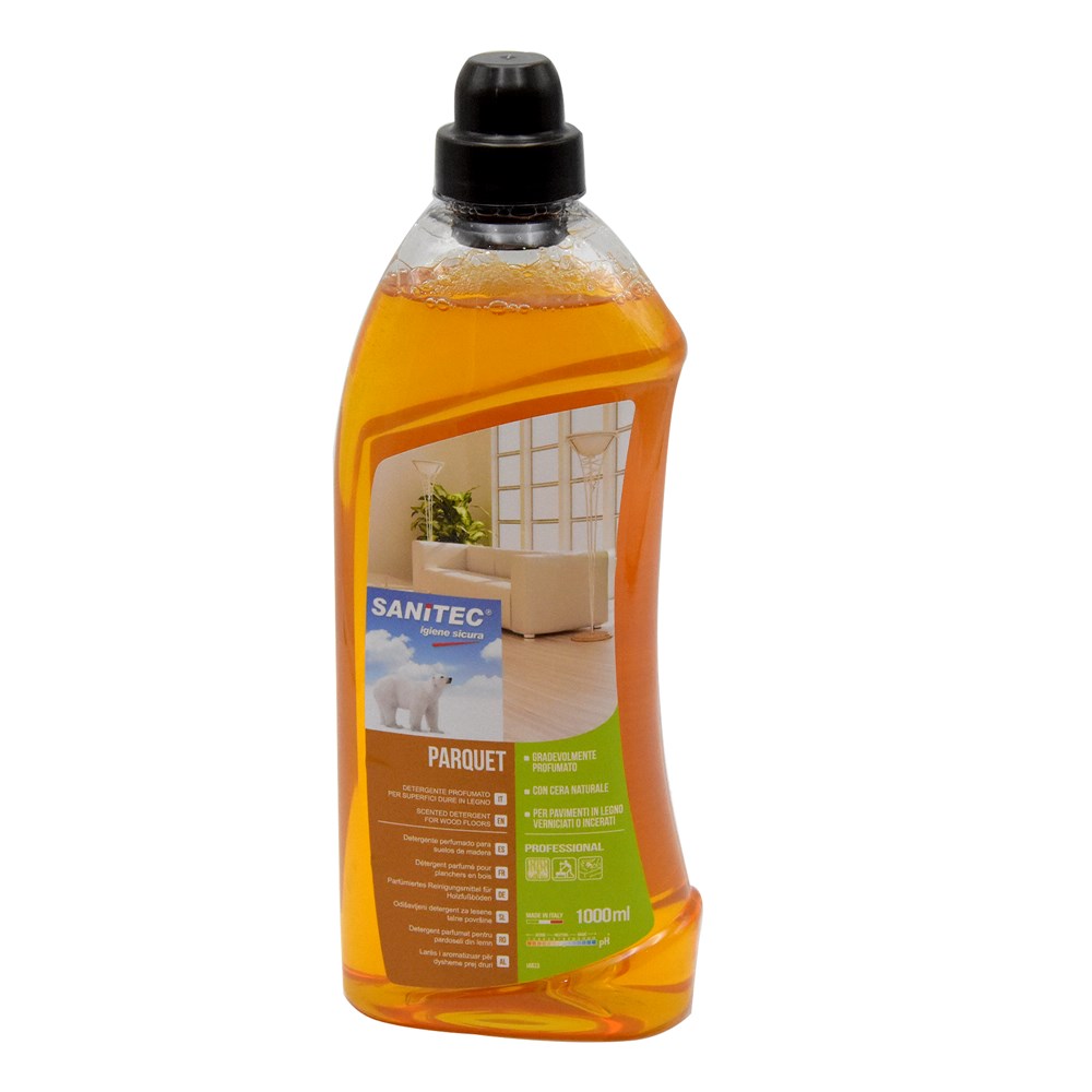 Sanitec detergent for daily cleaning of wood floors. Cleans thoroughly without rinsing, combining superior protection for treated surfaces leaving a pleasant scent.