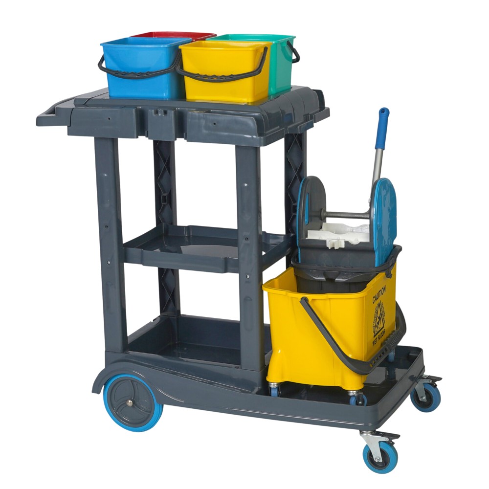 Professional bucket for cleaning large areas. The cleaning set contains the necessary accessories for an efficient cleaning. It is manufactured from durable plastic base and high resistance metal structure. Equipped with 4 buckets - 4x5 Lt and 1 x25 Lt, the end compartment holds the bucket which is used for washing the floor, also equipped with a plastic squeezer with a metal handle, the other floors are optional where you can place cleaning wipes, washers, sponges or any other accessories necessary for a better cleaning. The upper floor contains 4 buckets which are optional by the user, can be filled with clean water or other cleaning accessories can be placed. Thanks to the carrier and the wheeled device, its movement is very easy.