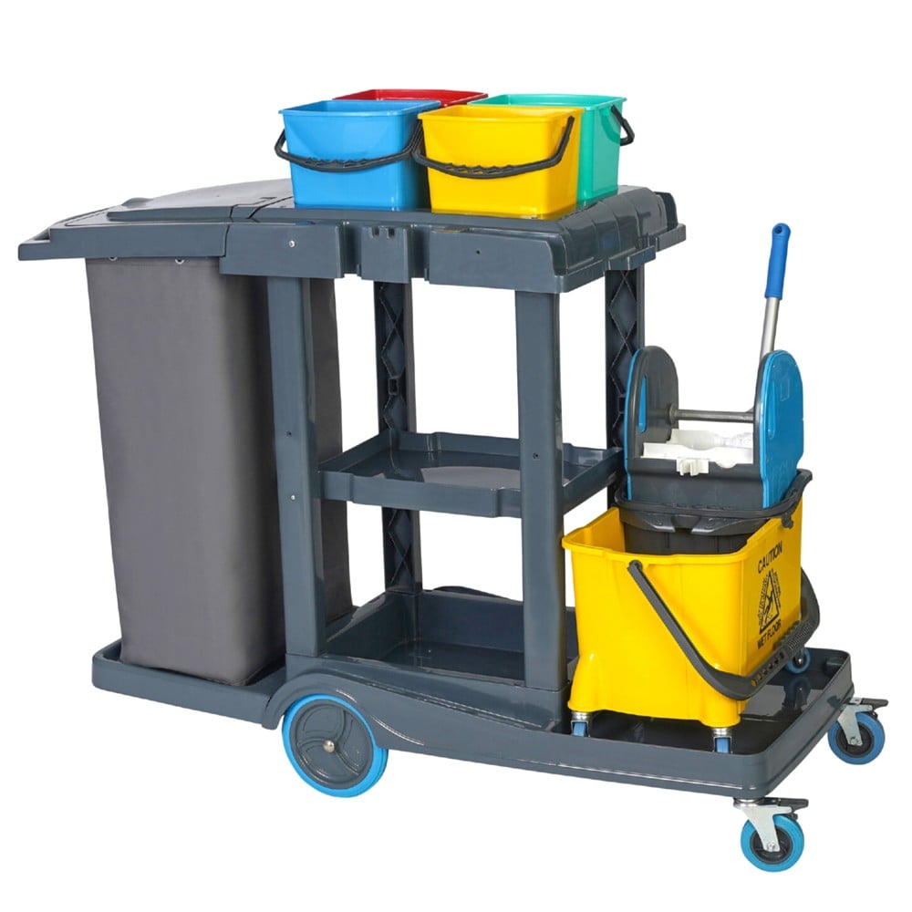 Professional bucket for cleaning large areas. The cleaning set contains the necessary accessories for an efficient cleaning. It is manufactured from durable plastic base and high resistance metal structure. Equipped with 4 buckets - 4x5 Lt and 1 x25 Lt, the end compartment holds the bucket which is used for washing the floor, also equipped with a plastic squeezer with a metal handle, the other floors are optional where you can place cleaning wipes, washers, sponges or any other accessories necessary for a better cleaning, as well as a holder for waste. The upper floor contains 4 buckets which are optional by the user, can be filled with clean water or other cleaning accessories can be placed. Thanks to the carrier and the wheeled device, its movement is very easy.