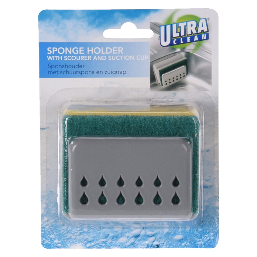 Double-sided cleaning sponge, made of soft polyurethane foam material, with coating of strong corrosive material on the bottom part, in green and yellow color, which is equipped with a plastic sponge holder, which allows the sponge to dry after use. It is used for washing dishes, cleaning table surfaces, cleaning tiles, cleaning metal surfaces, etc. It can be used with water, with various cleaning detergents. This product is suitable for professional and non-professional use, in indoor environments, restaurants, hotels, kitchens, etc. and it can be easily cleaned.