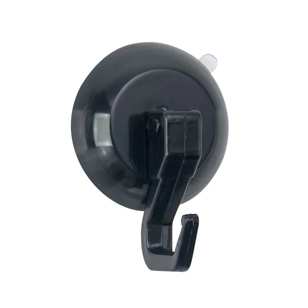 Towel holder, made of plastic material, with dimension of 5.5 cm, in black color. The towel holder is equipped with a hook for hanging clothes and with a suction cup attaching system, which allows for it to attach on any flat non-porous surface such as glass surfaces, mirrors, or tiles, without having to drill the wall. It is used to hold towels, bath sponges and clothes in toilets or to hold cleaning cloths, cooking aprons and other accessories in the kitchen. This product is suitable for use in professional and non-professional environments.