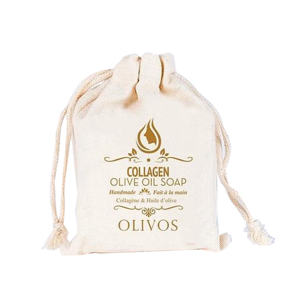 Soap in canvas bag, which contains extra virgin olive oil and collagen, with nutritional value for the skin. It preserves skin elasticity and moisture, it helps to rebuild the cells beneath the skin surface and eliminate wrinkles on the face and it can be used to remove acne scars, because collagen extract helps to rebuild damaged skin.