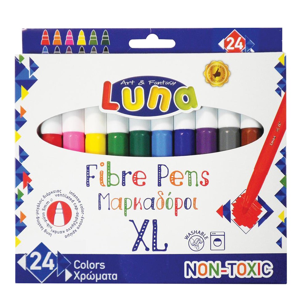 Colored felt-tip pens for kids, made of durable plastic material, with a cap that allows ventilation, with a reinforced felt tip, that resists the pressure exerted by the children's hand and has a line width of 5 mm. They contain dermatologically tested water-based ink, which can be easily cleaned from hands and clothes, with soap and water. The pens are used in schools and kindergartens, to draw or color and help develop imagination and creativity in children. This product is suitable for use by children from 6 to 13 years old.