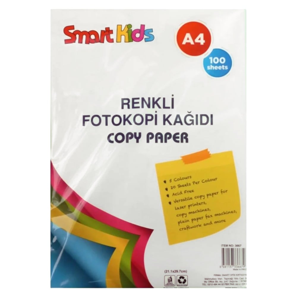 Smart Kids colored paper, 5 colors, 20 sheets, A4. This set includes papers in five different colors, designed for creative projects and art activities. Ideal for school use.