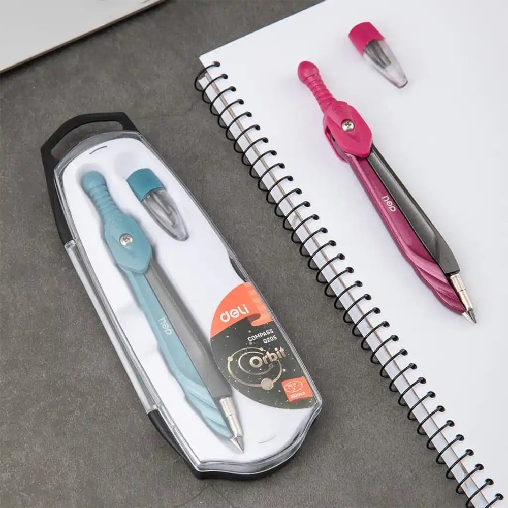 Deli pencil compass, metallic, mixed colors. This compass is durable and designed to deliver accuracy, making it suitable for everyday school and office use.