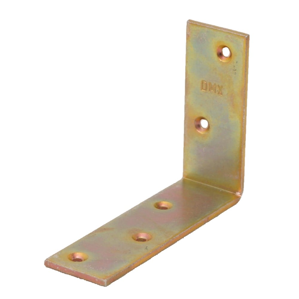Construction angle wood bracket, made of galvanized zinc material, with dimensions of 10x7.5x3x0.3 cm, in golden color, equipped with zinc powder outer coating, which protects it against corrosion and rust. It can be used to enable the best possible connection of wooden elements with each other or the connection of the wooden elements with the walls and floor. This product is suitable for use in both standard systems and individually designed connectors.