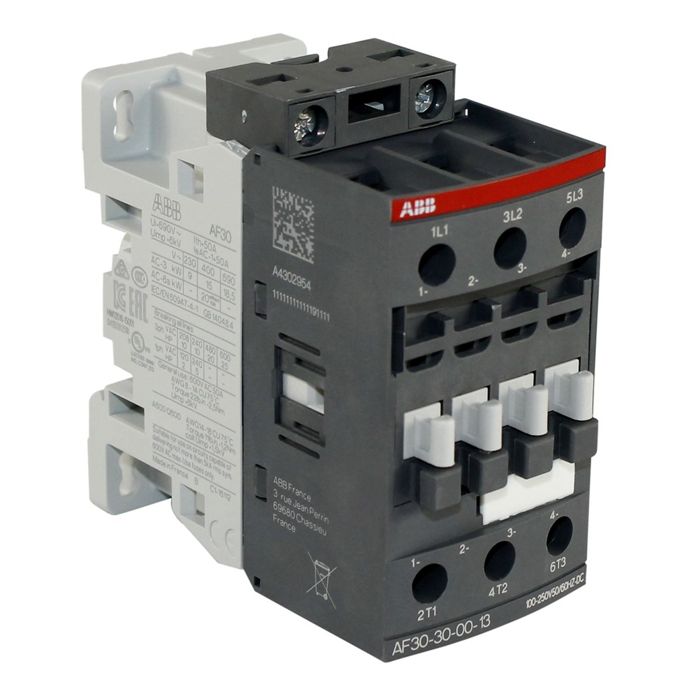 AF30 contactors are used for controlling power circuits up to 690 V AC and 220 V DC. They are mainly used for controlling 3-phase motors, non-inductive or slightly inductive loads. AF... contactors include an electronic coil interface accepting a wide con