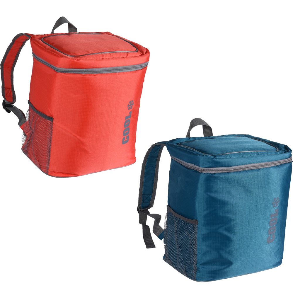 Thermal bag, made of Ripstop polyester material, with aluminum lining, with a carrying capacity of 16 l, in different colors. The bag is equipped with a carry top handle, with shoulder straps with an adjustable length, which allow for an easier holding during use, with a large compartment with double zipper closure and with a side pocket made of mesh material, which is used to carry the water bottle. It can be used to store various foods and beverages at a cool temperature and it has a cooling effect that lasts from 3 to 9 hours if used with cooling pads. This product is suitable for use in camping, picnics, beach, outdoor trips, hiking, etc.