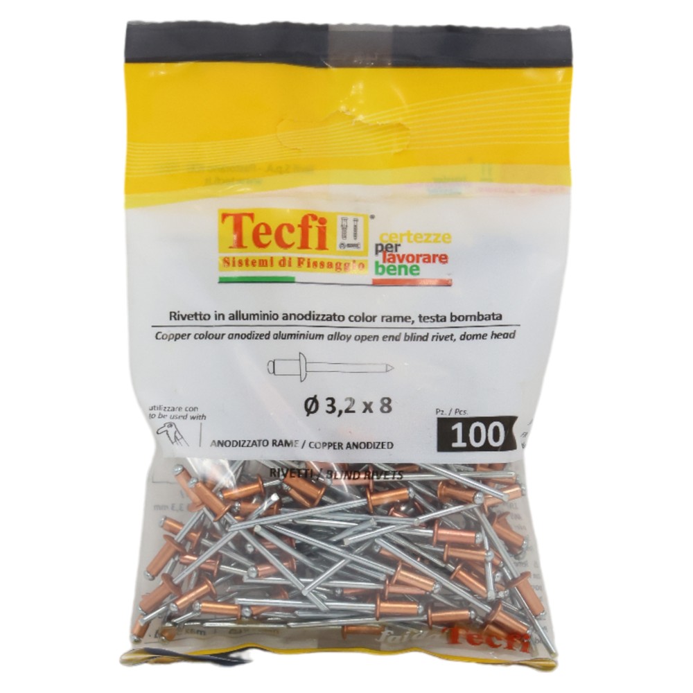 Copper anodized dome blind rivet,al/zp steel, Ø 3,2x8mm, Bag 100