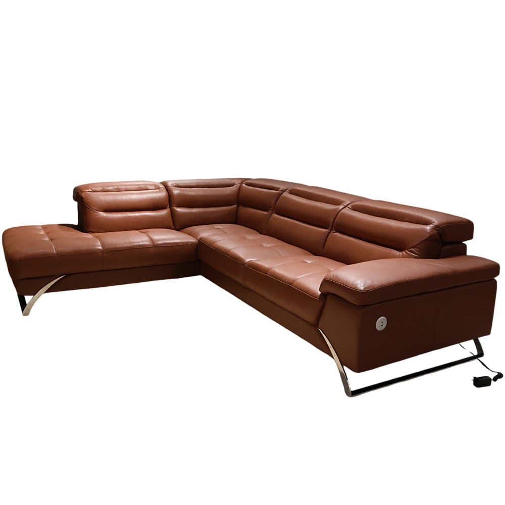Corner sofa, with canape on the left side, with measurements of 182x334xH75(98) cm, with leather upholstery, in venetian red color. The supporting structure is composed of durable wooden bars and melamine. The sofa is equipped with 2 USB ports integrated into the side, which allow you to easily use your electronic devices while you rest. The outer covering is composed of soft natural leather on the upper part and processed ecological leather on the back of the sofa. The medium-soft interior padding consists of high-density foam materials, and the exterior structure is equipped with static metal legs. The sofa is equipped with 3 adjustable headrests in the upper part, which can be opened up to a height of 98 cm and allow you to adjust it as best as possible to have the most comfortable, ergonomic and natural posture. The soft natural leather upholstery material gives your living room a modern and luxurious look. The minimalistic and functional design makes this product an optimal choice for your interior environments.