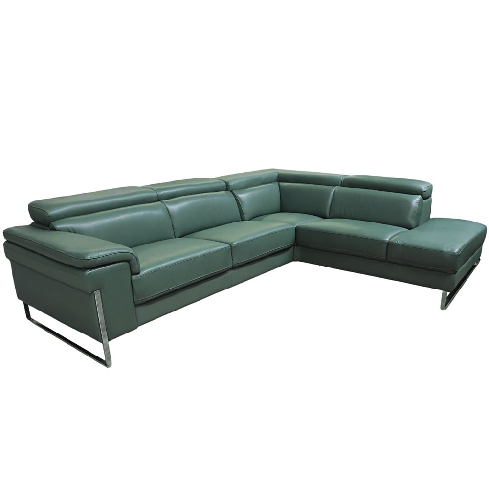 Corner sofa, with canape on the right side, with measurements of 188x337xH81(100) cm, with leather upholstery, in dark green color. The supporting structure is composed of durable wooden bars and melamine. The medium-soft inner padding consists of high-density foam materials and the outer structure is equipped with static stainless steel legs. The sofa is equipped with 3 adjustable headrests in the upper part, which can be opened up to a height of 100 cm and allow you to adjust it as best as possible to have the most comfortable, ergonomic and natural posture. The soft natural leather upholstery material gives your living room a modern and luxurious look. The minimalistic and functional design makes this product an optimal choice for your interior environments.