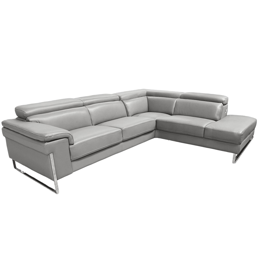 Corner sofa, with canape on the right side, with measurements of 188x337xH81(100) cm, with leather upholstery, in light gray color. The supporting structure is composed of durable wooden bars and melamine. The medium-soft inner padding consists of high-density foam materials and the outer structure is equipped with static stainless steel legs. The sofa is equipped with 3 adjustable headrests in the upper part, which can be opened up to a height of 100 cm and allow you to adjust it as best as possible to have the most comfortable, ergonomic and natural posture. The soft natural leather upholstery material gives your living room a modern and luxurious look. The minimalistic and functional design makes this product an optimal choice for your interior environments.