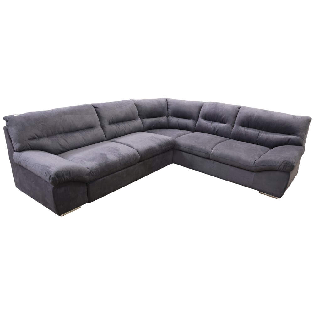Corner sofa, with canape on the right side, with measurements of 290x254 cm, with textile upholstery, in dark blue color. The supporting structure is composed of durable beech and spruce wood bars, as well as melamine material, without formaldehyde content. The medium-soft inner padding consists of foam material, PVC free, with reinforcing steel springs and static chrome legs. The sofa seat can be opened allowing it to turn into a bed, with a surface area of 204x121 cm. The upholstery material is stain resistant and can be easily cleaned with a damp cloth. The minimalistic and functional design makes this product an optimal choice for your interior environments.