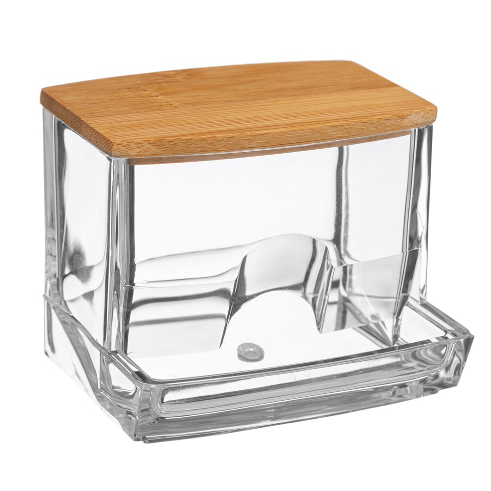 Cosmetic cotton pads storage case, with transparent polystyrene material, in a rectangular shape, with a lid made of bamboo wood. It is used to keep makeup cleansing cotton pads organized and easily accessible. This product is designed to meet the storage needs of any room in the house and make the most out of limited space, which makes it suitable for travel.