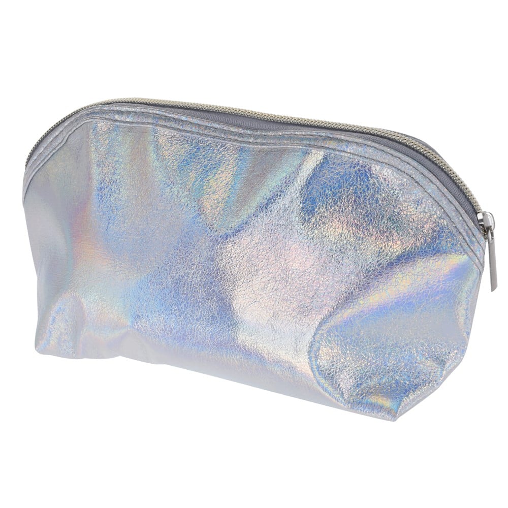 Makeup pouch bag, made of polyester and polyurethane material, in luminous silver color. It can be used for storing and carrying various cosmetic products, such as creams, shampoos, makeup products, perfumes, various lotions or other accessories. It has small dimensions, which make it suitable to take with you on trips.