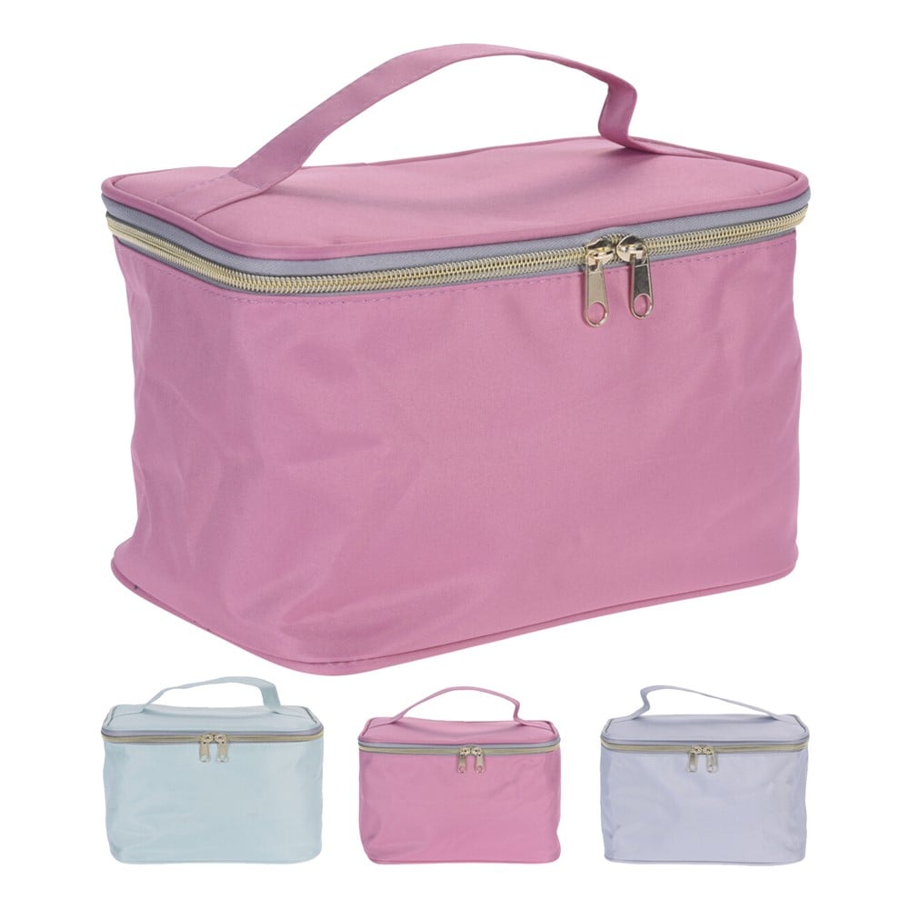 Cosmetics storage bag with top handle, made of polyester material, in different colors, which is eqquiped with a double zipper and with a small pocket on the inside. It is used for storing and carrying various cosmetic products and personal hygiene products, such as creams, shampoos, makeup products, perfumes, various lotions or other accessories, as well as for organizing them in travel bags. This product is lightweight and has compact dimensions, which make it convenient to take with you on trips.