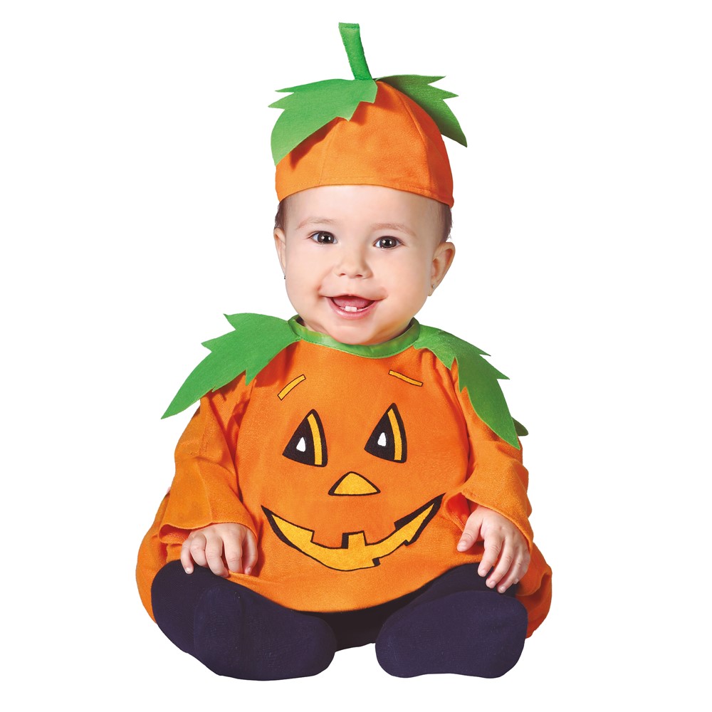 Baby suit with pumpkin cape, made of anti-allergic polyester material in orange color with green leaves. The dress consists of the cape and the hood. Suitable for ages 12-24 months with body length 89-93 cm. Black overalls are not included in the set.