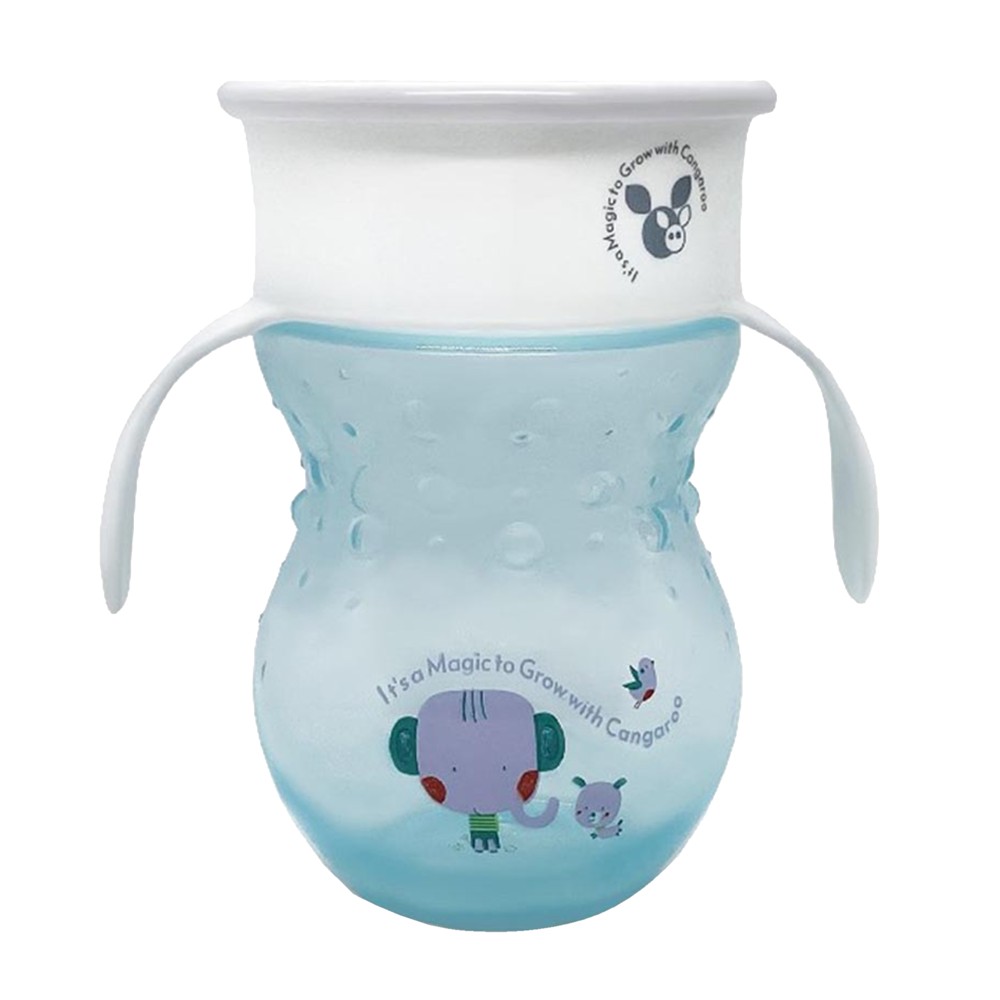 Children's glass, blue, with a capacity of 270 ml. This magical educational glass for children helps them to consume water and fruit juices in their daily life, and not just milk. The cup is equipped with a 360° silicone base, which closes immediately after the child stops drinking, preventing leakage. Soft silicone also protects the teeth from possible damage. It has two handles for easier holding, and a plastic cover that protects the drinking area from dirt. It is recommended to be used by children over 6 months.