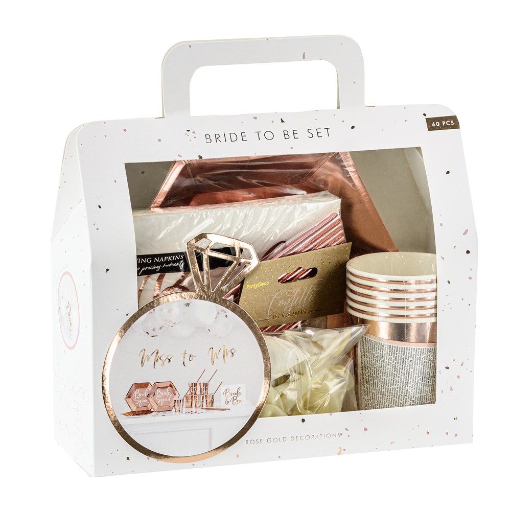 Decorations for Bachelorette (bachelor party) set in the golden color of pink, set contains: Miss line for Lady (1 piece), paper cups (6 pieces), paper plates (6 pieces), paper straw (10 pieces), napkins paper (20 pieces), confetti (15 g) and white latex balloon), 10 pieces and Crystal Clear, 6 pieces).