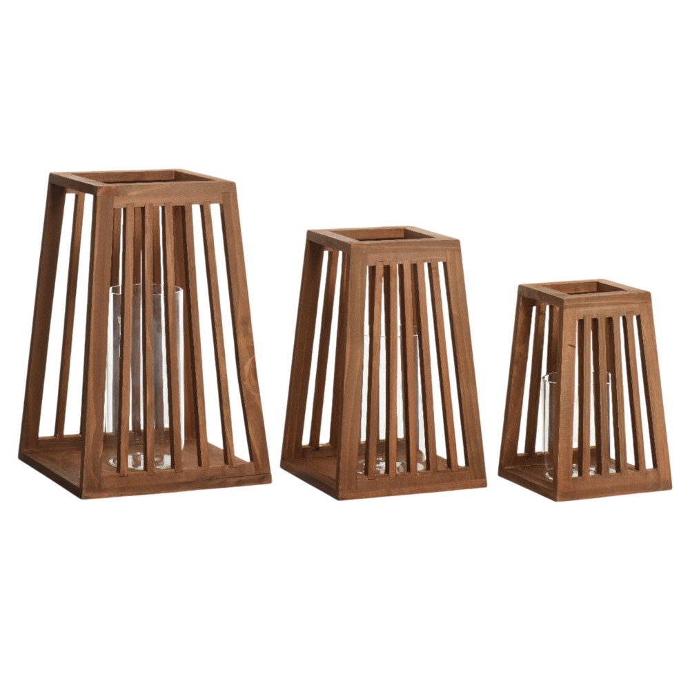 Decorative lantern, set 3 pieces, wooden, brown, L:20x20xH30cm, M:16x16xH25cm, S:13x13xH20cm