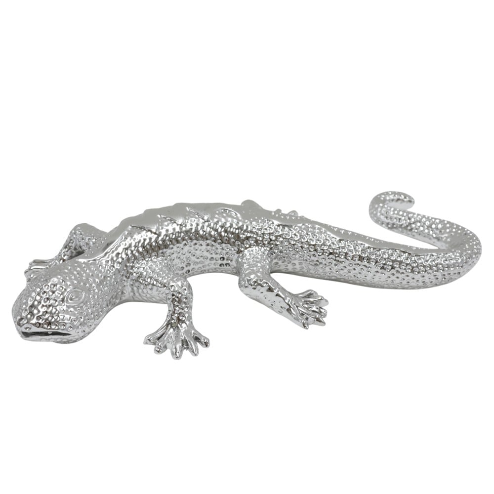 The decorative object "Lizard", made of silver-colored resin and measuring 30 cm, is a modern and unique accessory that brings a sense of stylization and dynamism to any environment. With its detailed design and elegant shape, this sculpture represents the spirit of nature and spreads a fresh and sophisticated atmosphere. The silver color gives it a special shine, reflecting the light and creating a warm and luxurious atmosphere in the space. The resin material is durable and easy to maintain, preserving the details of the shape and ensuring a product that will last for a long time. This decorative object is suitable for both your homes and office spaces. The ideal solution for those who want to add a touch of nature close to them.
