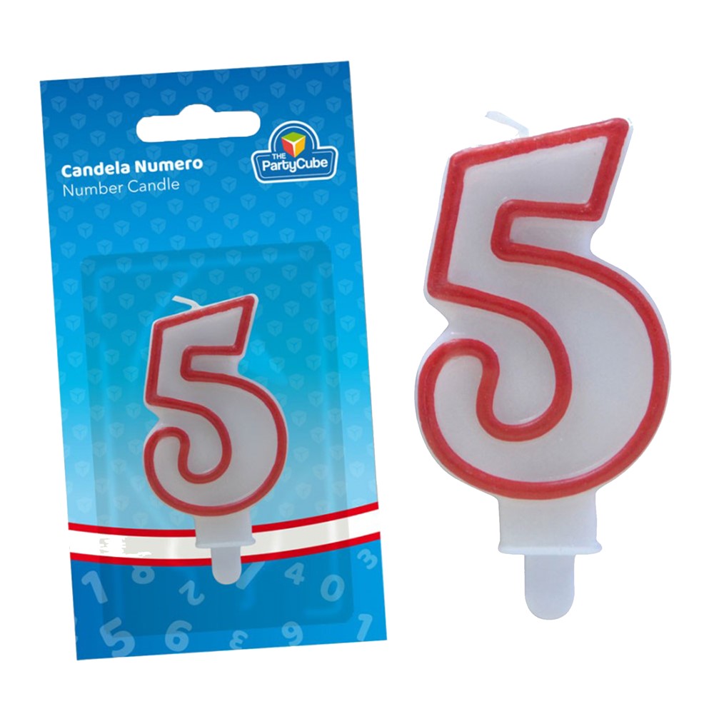 Decorative candle for parties, in the shape of the number 5, with dimensions of 6.5 cm. It is used to be placed on cakes, during birthday parties or various anniversaries.