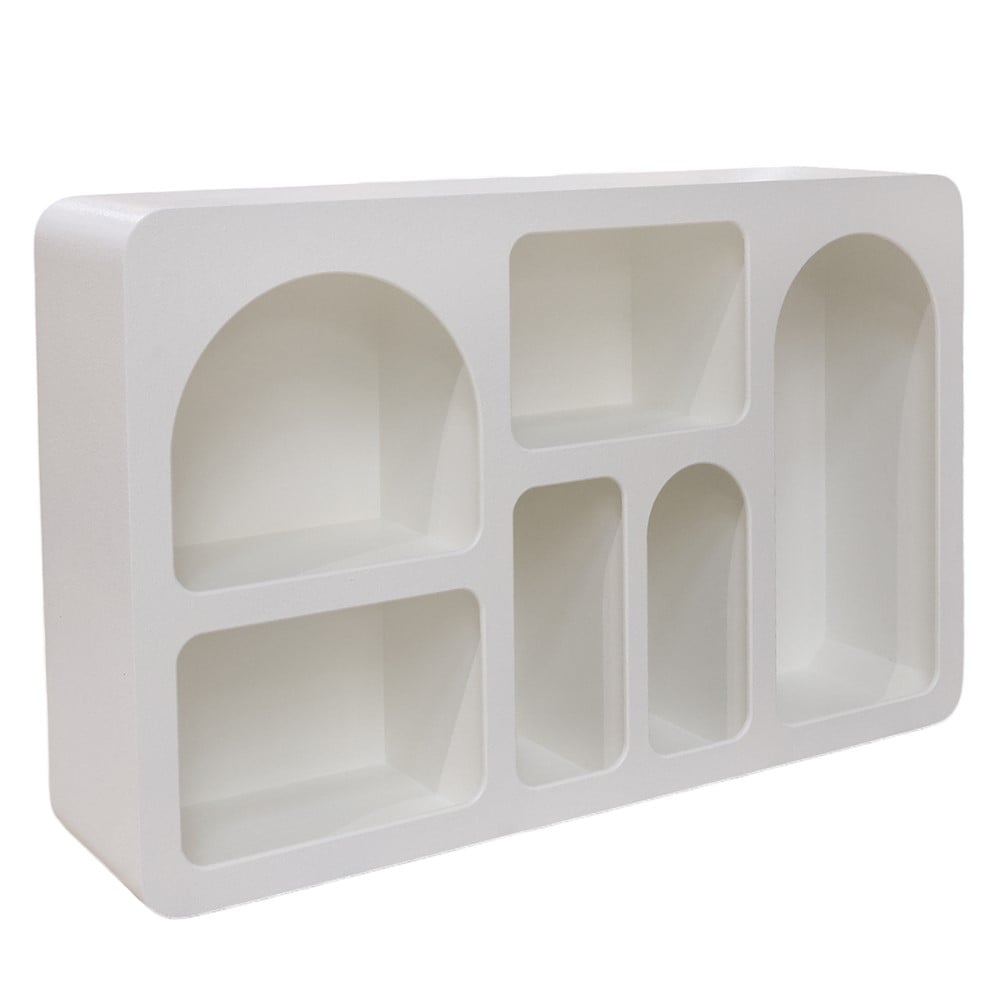 The decorative shelf ''Irine'' will give a minimalist and modern look to your environment. Designed in white MDF material, this shelf easily adapts to all types of furnishings. Its curved and straight sergeants allow for special and personalized decoration. Do not hesitate to make it yours for both home environments and your business.