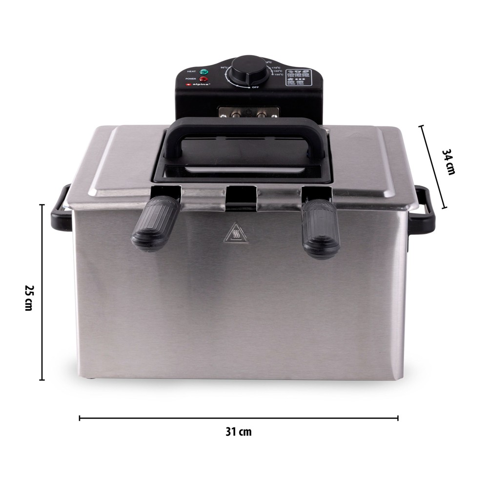 With this double deep fryer from Alpina you can quickly fry fries and/or snacks for the whole family. The deep fryer has 3 frying baskets, 1 large and 2 smaller, so you can also fry all kinds of goodies at the same time. This way you can choose whether this is a single or double deep fryer. And that is very useful when there are hungry diners waiting at the table. This way you can serve a large mountain of fries or a combination of snacks and fries at the same time. Frying with this deep fryer is a piece of cake. In addition to the adjustable thermostat that goes up to 190 °C, you will find a schedule with different foods and their frying temperatures. You select the correct temperature and when the indicator light goes out, you lower the frying basket(s) with food into the hot oil. The deep fryer has a capacity of no less than 5 liters and a power of 2000 Watts. The housing is made of brushed stainless steel and the frying baskets are also made of durable stainless steel. Thanks to the removable inner pan and the removable electric element, the deep fryer is easy to clean.