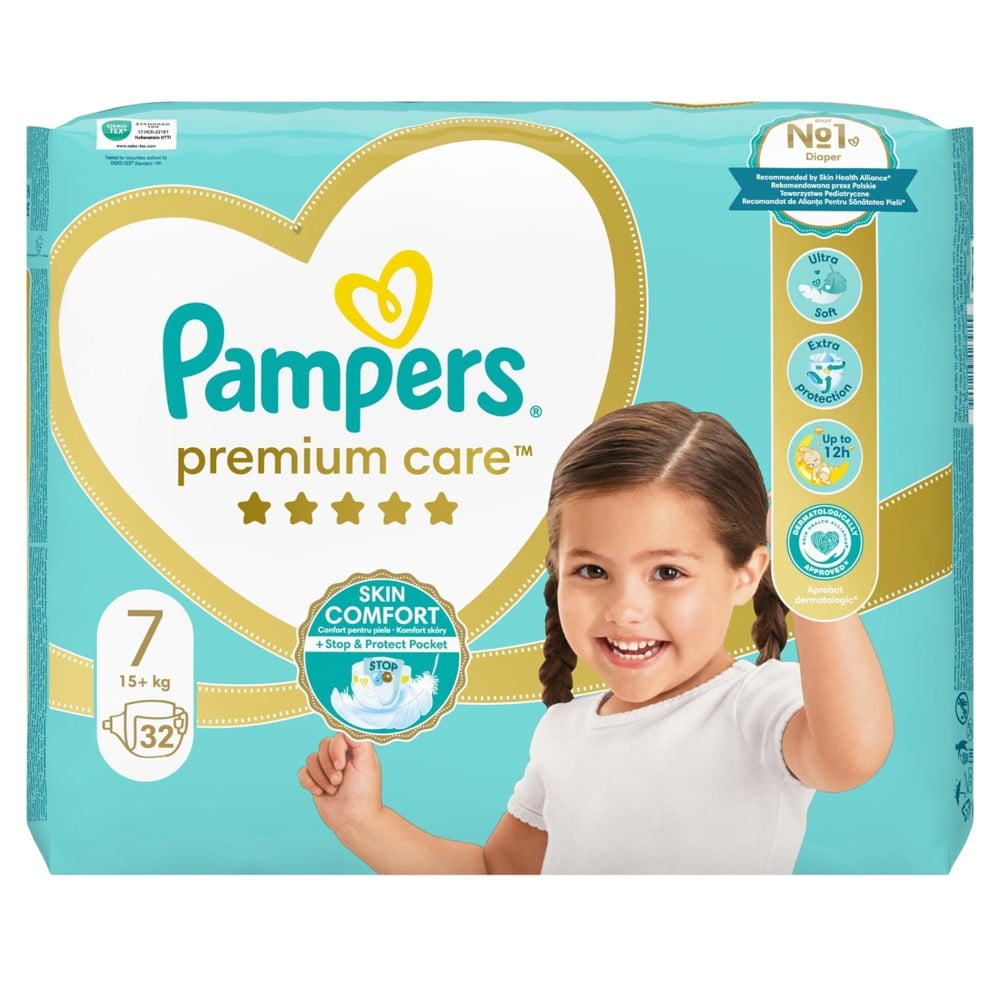 Baby diapers, made of clinically tested hypoallergenic cotton material, with Extra Absorb Channels technology for even moisture distribution for up to 12 hours and with Absorb Away Liner™ protection to keep moisture and dirt away from the skin. The micro-pore structure allows the skin to breathe, avoiding redness or irritation due to excessive moisture, which makes them suitable for sensitive baby skin. The diapers are equipped with a specific indicator, which changes color from yellow to blue, when the baby needs to be changed. The strong and elastic adhesives on the side do not allow leakage and are comfortable to enable free movement of the baby. This product is suitable for babies weighing 15+ kg.