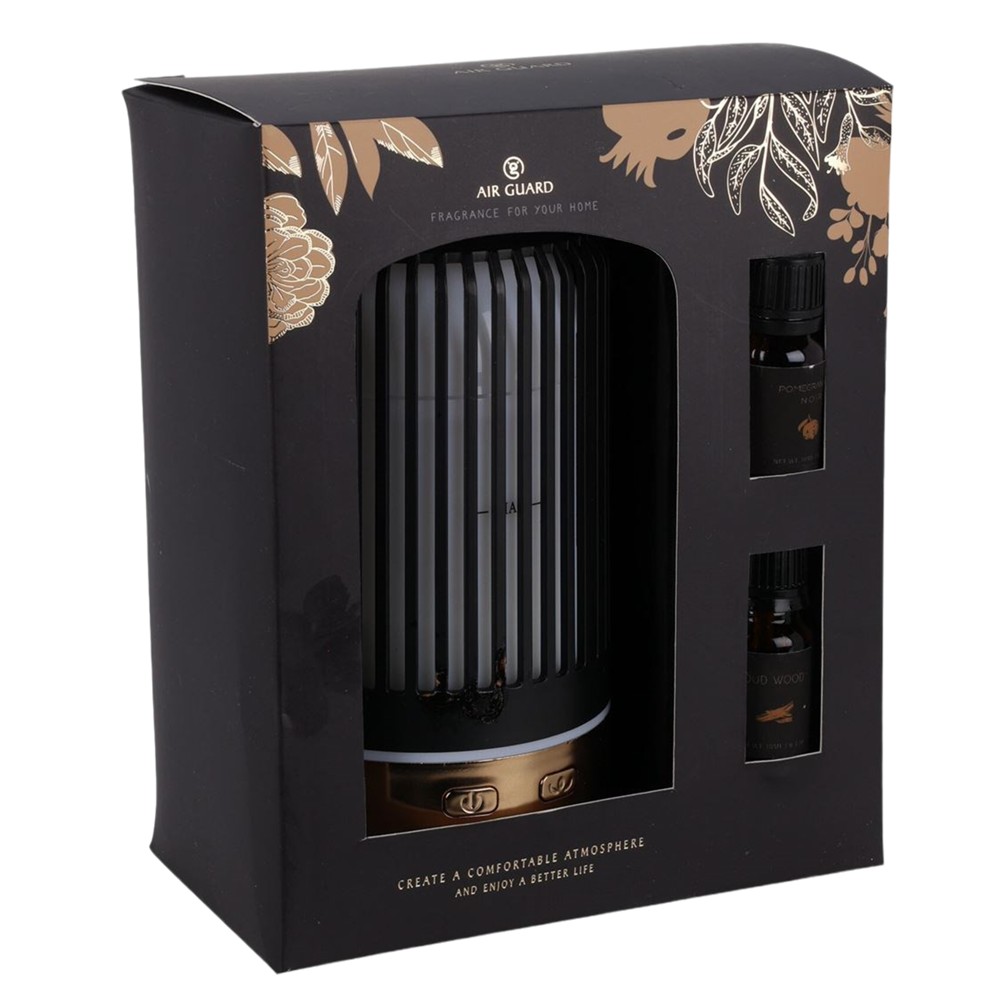 The air freshener with 2 different scents will keep your home always fresh. Conceived in black and gold colored glass, this aromatizer is not only practical but also modern. The set consists of a diffuser and 2 refills of 10 ml each with 3 different scents.