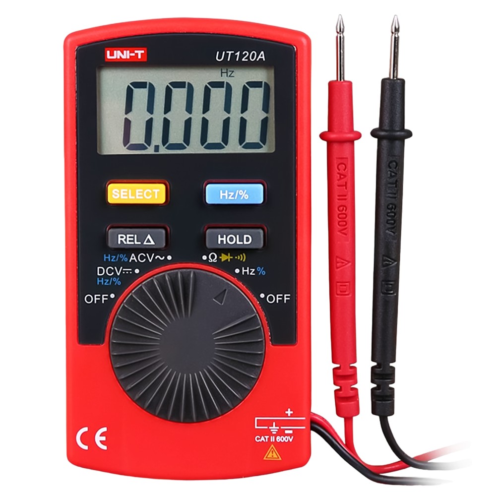 UT120A Pocket digital multimeter. The UT120 series multimeters are designed for do-it-yourselfers and electronic engineers for troubleshooting electronic system development and electronic circuits. It is a simple and portable multimeter for every electronics engineer. DC voltage (V) 600V ±(0.8%+1) AC voltage (V) 600V ±(1.2%+3) Resistance (Ω) 40MΩ ±(1%+2) Frequency (Hz) 100kHz ±(0.5%+3)