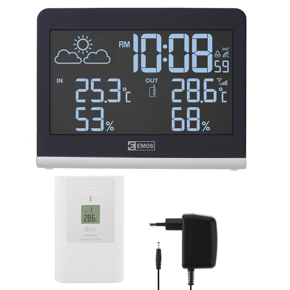 Digital Thermometer E0300 with 1 wireless sensor, date, time zones, calendar, alarm, humidits,LED desplay 7x12.2cm, -20 °C/+60 °C, 4.5 V DC/300 mA / 1x 3V CR2032, 10×6.5×3.5 cm, d= 30m
