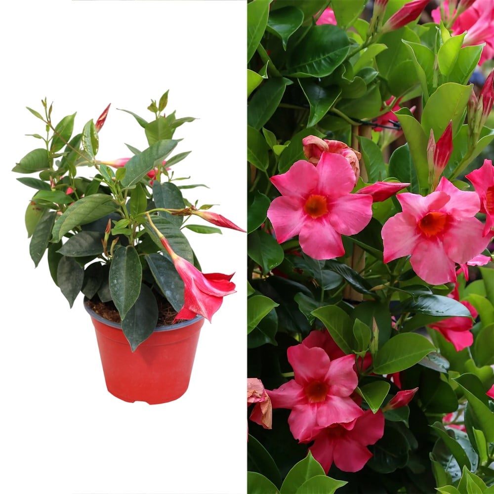 The plants thrive in summer but have to be moved indoors in the cooler season. The plant is similar to mandevilla and works outside in warm zones, or indoors as an accent houseplant. Dipladenia is a bushy plant whose stems grow and hang down. The plants have trumpet-shaped flowers with bright colors, but they have a larger flower usually in red, pink. Plants need bright light. The leaves are fine and the flowers beautiful in a wide range of colors.