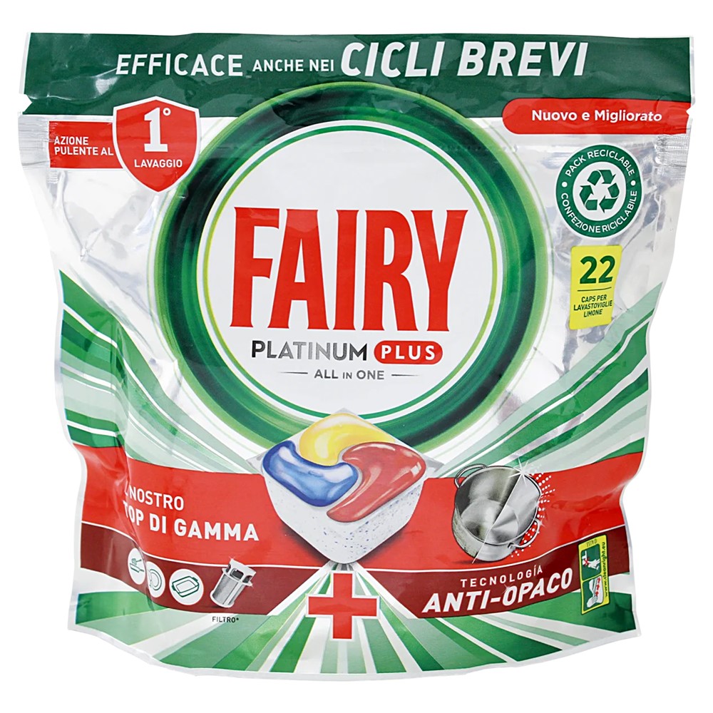 The new Fairy Platinum Anti-Opaco formula, which has a cleaning action in 1 wash. Use Fairy anti-calc dishwasher cleaner. An exceptional cleaning power for dishes. Exceptional cleaning power for melted grease and tough stains.