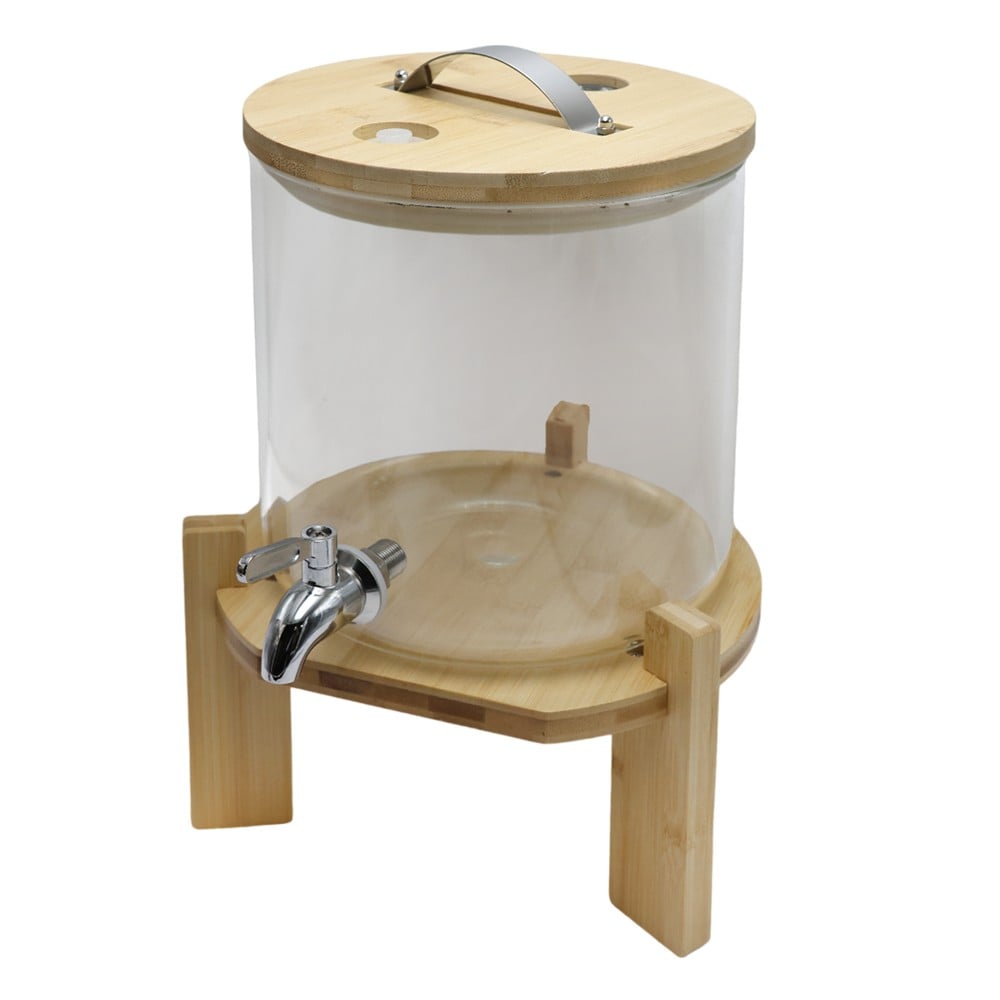 The dispenser jar with faucet and thermometer is an excellent choice for serving juices, cold drinks, or other liquids in a convenient and stylish way. The combination of the transparent glass body with bamboo details gives it an attractive and natural look, making it a beautiful addition to any event or setting.