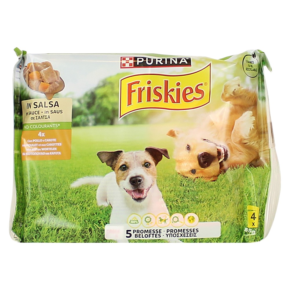 Friskies Dog Adult is a tasty and nutritious snack for adult dogs, which comes in a pack of 4 bags of 85 grams each, with chicken and carrot. This combination of rich and healthy ingredients offers a pleasant taste and helps meet your dog's daily nutritional needs. Suitable as a reward during training or as a special treat between meals, this snack is easy to chew and loved by most dogs. With guaranteed quality from Friskies, it is a delicious way to show care and love every day.