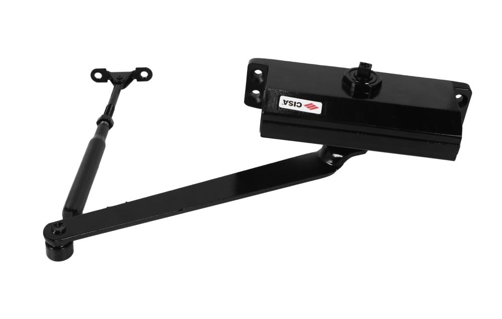 Door closer comes with a size four spring tension and in an aluminum finish. The closer is recommended for use on all aluminum store front doors, wood or hollow metal commercial applications. It is a versatile utility closer that provides narrow styling. For doors weighing up to 40-65 kgs.