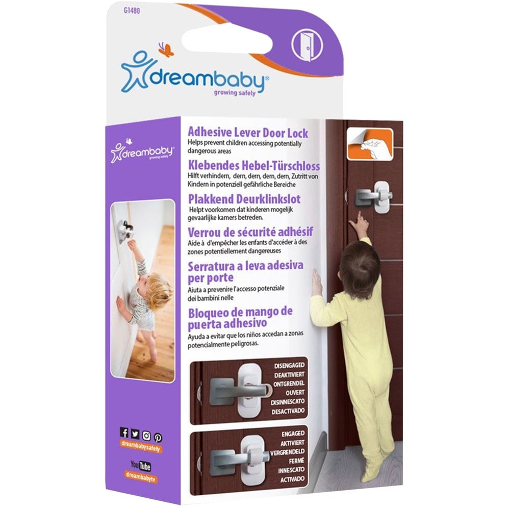 The adhesive door handle lock helps prevent children from gaining access to potentially dangerous areas such as laundry rooms, garages and other spaces. The lock can be activated and deactivated without a key. Fits most door handles.