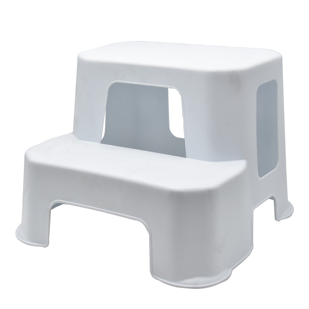 Double-step stool for children, made of plastic material, in white color, equipped with bordered support legs, to protect against slipping. It is used to help teach young children to use the adults' toilet, as well as to easily reach the sink for washing hands or for brushing teeth. This product is suitable for use by children over 2 years old.