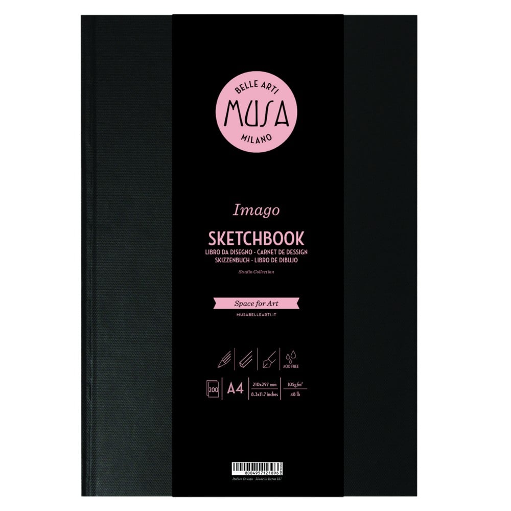 Drawing notebook, Musa is a series of sketchbooks for fine arts students, artists and amateurs. Textured, rigid and sturdy black cover to efficiently protect your work. Refined magenta laminated logo printed on the back. The paper is natural white fine grain and made from 100% quality cellulose. It is acid-free and has a neutral pH for long-term preservation. It guarantees good erasability. Slightly rough, ideal for quick sketching in pencil, pen, charcoal, sanguine, pastel, graphite, chalk. Also suitable for writing.
