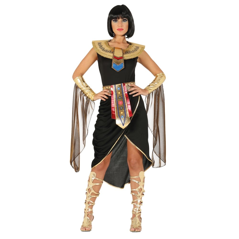Queen's Egyptian themed suit, the suit is made of 100% polyester material, from a long dress in black, 1 large oval collar in gold, 2 half tulle gloves hanging in gold and black and 1 belt in the middle in gold color with ties.Size M (36-38), Chest size: 80-90 cm