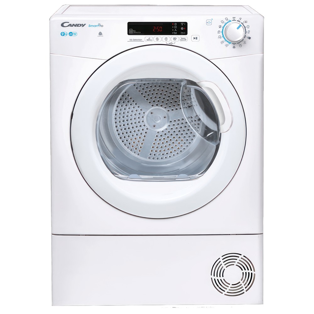 The Candy Smart Pro tumble dryer is a smart time-saving choice. Versatile, fast and reliable, the Candy Smart Pro Tumble Dryer offers a full set of quick cycles in less than 90 minutes to meet your daily needs. SMART DESIGN, EASY TO USE. Say goodbye to back pain while loading laundry. The door opening on the new Candy machines is designed to be higher than all others, in order to allow the machine to be loaded and unloaded as easily as possible. our dryer will know how to treat woolen items, thanks to the temperature control and the special drum rotation rhythm. This means you don't have to worry about damaging your most delicate wardrobe: simply set the Woolmark-approved program and the machine will minimize the effects of friction and gently dry things at a lower temperature. CHOOSE THE BEST MOMENT TO DRY YOUR LAUNDRY. The new Candy dryers are designed to make your day easier, so that's why you can start the drying cycle exactly when you want it, with the possibility of delaying the start of drying up to 11 p.m. With this option, you can start the drying cycle at night, so you can take advantage of a cheaper electricity tariff or turn it on while you are at work, so that you have freshly dried laundry waiting for you when you get home. Devices with WIFI connectivity offer the possibility of remote control via the simply-Fi app with access to a wealth of useful content such as additional features, tips and tricks for maintenance and technical support. SAVE YOUR FAVORITE SETTINGS. Once you find the perfect setting for each cycle, you can save them for future use. With the Memory function, instead of selecting programs and options each time, you can do everything at the touch of a button. Candy tumble dryers offer an innovation on the market - as many as 7 fast programs lasting from 30 to 90 minutes, for all user needs. Versatility, speed and reliability - a smart solution with the best value for money. Stay in touch with your tumble dryer with the Candy simply Fi app. With the DOWNLOAD CYCLES function, download and run more than 20 additional drying programs. TWICE LESS CRUSHING, TWICE LESS IRONING. Your new dryer reduces the amount of folds thanks to the special drum rotation rhythm in both directions and the anti-creasing system, before and after the cycle. The smart moisture control sensor also guarantees the perfect humidity level for easy ironing. SAVE UP TO 70% OF TIME AND MONEY. Don't be afraid to put a small amount of laundry in the dryer - Candy has the perfect solution that will allow you to save up to 70% of energy and time. Special weight and humidity sensors measure the amount of laundry and automatically stop drying when the laundry reaches the desired level of dryness. Thanks to this technology, it is possible to dry from 1 kg to the maximum capacity without unnecessary costs or drying of laundry. Drying has never been easier! Thanks to the guided drying function, your machine suggests the ideal program by providing information such as the type of fabric or the desired drying level. Alternatively, thanks to the synchronization function, your App can tell you the best drying program and set the exact duration, based on the weight and the wash cycle that has just been performed. How to watch the consumption? Simply open the hOn App and get real-time statistics and consumption reports to improve your usage habits. In addition, the App sends you reminders about all necessary maintenance activities, in order to extend the life of your device and ensure great performance for years to come. The ideal solution for every need! Open the Candy hOn app and access a list of more than 40 programs that allow you to quickly get the best drying level for your clothes. In addition, you can organize your routine by saving the most frequently used cycles and setting reminders for the end of drying. With the Candy hOn app, using your machine has never been so easy! Open the Application and enjoy a wide range of programs, features, tips and usage statistics. In addition, thanks to the remote multi-control, you will be able to control your device wherever you are via your smartphone.With the Candy hOn app, using your machine has never been so easy! Open the Application and enjoy a wide range of programs, features, tips and usage statistics. In addition, thanks to the remote multi-control, you will be able to control your device wherever you are via your smartphone. With the Snap&Dry function, laundry care becomes even more innovative! At the end of the wash, simply take a photo of your wet clothes and find out which is the best and fastest drying program. That way you can save both time and money.